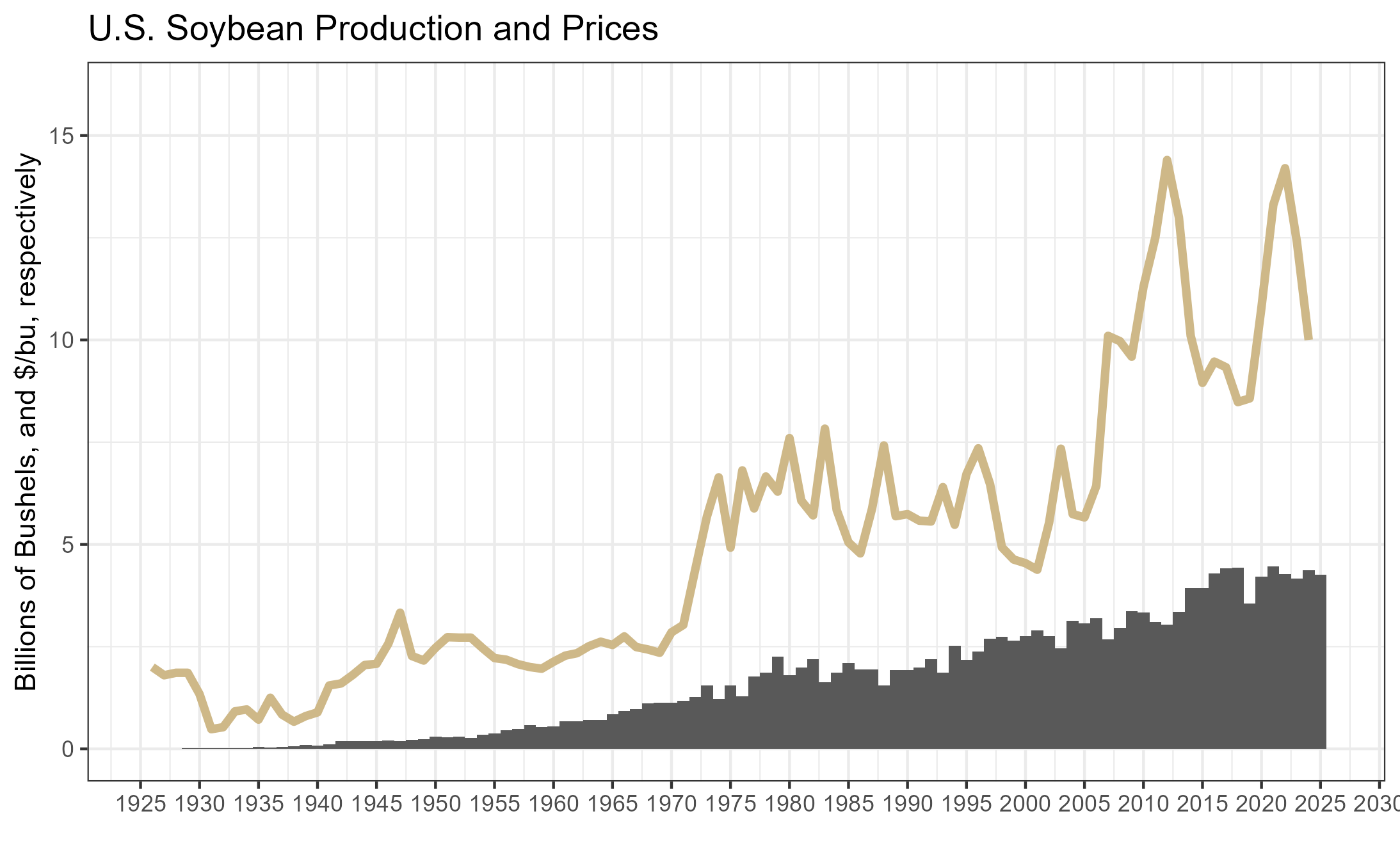 Soybeans were not commonly planted in the U.S. until the mid 20th century, but once it was introduced, acreage expanded rapidly. Soybeans have also benefited from improved yields due to biotechnology.
